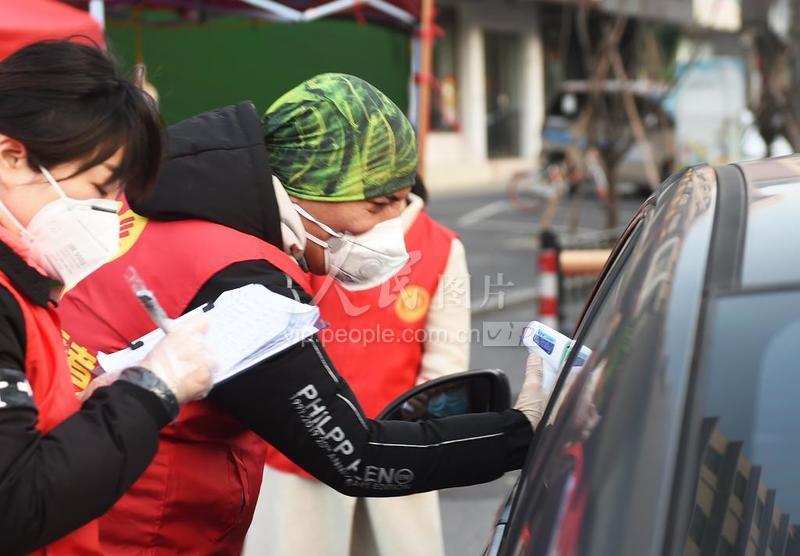 2月5日,伊朗客商哈米對進入雞鳴山社區(qū)的人員測體溫。