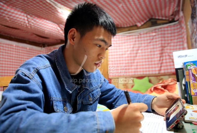 3月17日,廣西融水苗族自治縣四榮鄉東田村田頭苗寨,融水中學二年級學生潘遠用手機上網課。