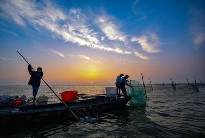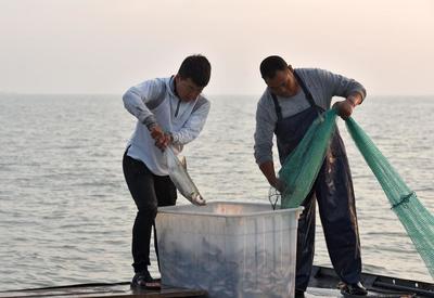 2020年7月1日,江蘇省宿遷市駱馬湖,漁民在湖中收網捕魚。當日,駱馬湖結束了為期5個月的禁漁期。由于漁民休漁意識明顯增強,加之漁政部門增殖放流力度的加大,湖區水生生物資源得到了有效的恢復。開捕首日,花鰱、白魚等湖鮮水產品肉肥體大,魚躍人歡的豐收場景隨處可見。