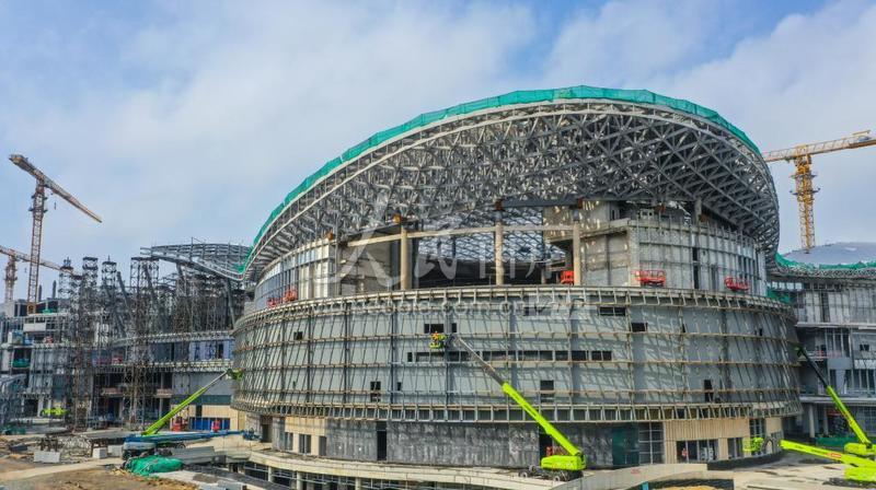 2022年2月7日,海口國際免稅城項目,工人在進行外幕墻施工。 目前,該項目商業中心的屋面網殼和外幕墻施工已進入收尾階段,暖通安裝已完成68%,2022年將投入運營。