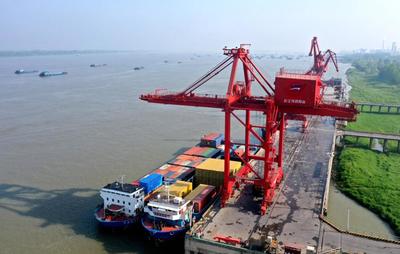 2022年4月21日,港口機械在安徽銅陵港長江外貿(mào)碼頭裝卸物資。
