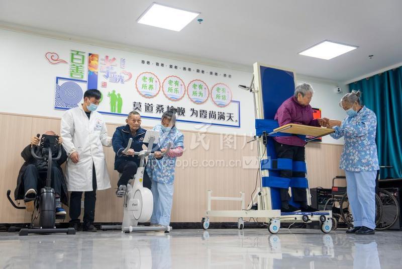 2022年11月30日,江西省吉安市吉水縣雙村鎮(zhèn)醫(yī)養(yǎng)服務(wù)中心,工作人員正在帶領(lǐng)老人做康復(fù)訓(xùn)練。