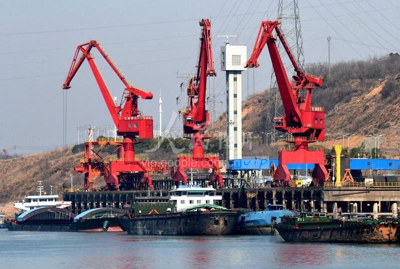 2023年1月31日,港口機(jī)械在安徽銅陵港長(zhǎng)江笠帽山港區(qū)裝卸物資。