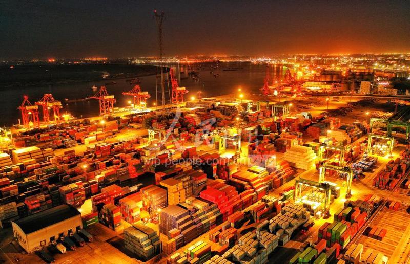 2023年4月29日晚,江蘇省張家港港集裝箱碼頭燈火通明,工人們在碼頭上有序進行裝卸作業。 “五一”假期到來,江蘇省張家港港數千名碼頭工人依然堅守崗位辛勤工作,對進出港的各種貨物及時進行裝卸作業,確保“貨物不壓港”,供應鏈物流鏈暢通。