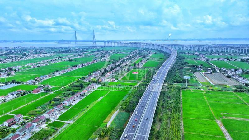2023年8月14日, 初秋時節(jié),俯瞰長江岸邊的江蘇省張家港市錦豐鎮(zhèn)新港村,稻田、村莊、鐵路、大橋與長江交相輝映,一幅水清岸綠畫卷正徐徐展開。