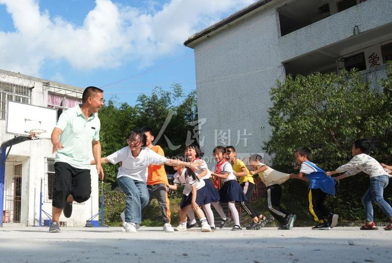 2023年9月6日,在廣西柳州市融水苗族自治縣桿洞鄉高培村小學,梁忠林(左一)、梁巧(左二)父女在課間和孩子們一起玩游戲。