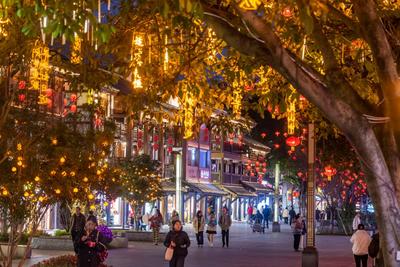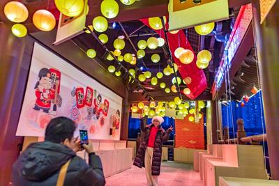 2024年1月22日晚,重慶磁器口古鎮(zhèn),迎春燈飾吸引游客游覽。