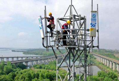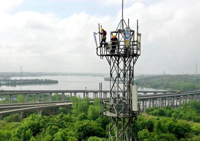 2024年4月18日,在安徽省銅陵市大通鎮上水橋交通樞紐通信塔上,安徽移動銅陵分公司工作人員在進行“信號升格”專項行動設備更新升級。